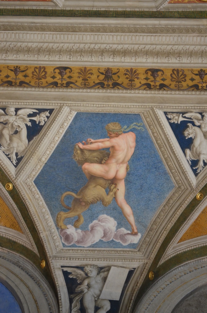In addition to the zodiac and the story of Galatea, there were other mythological events being depicted in various smaller hexagrams. One of Genene's favorites was Hercules battling a lion, bare-handed (and bare-butted). Look out for those claws, Herc!