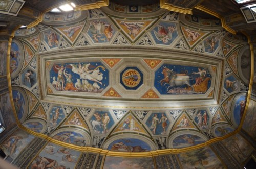 The villa was commissioned during the Renaissance by a Sienese banker name Agostino Chigi. Like most rich people, he wanted to show off, and the interior is richly decorated with frescoes. One of the rooms, the Loggia of Galatea, shows all of the astrological signs as they were on Chigi's birthday. Talk about your ego. I borrowed a fish-eye camera lens from a friend (thanks, Bryan), and it is a very handy tool to give you an idea about the size and intricacy of the ceilings.