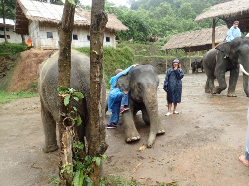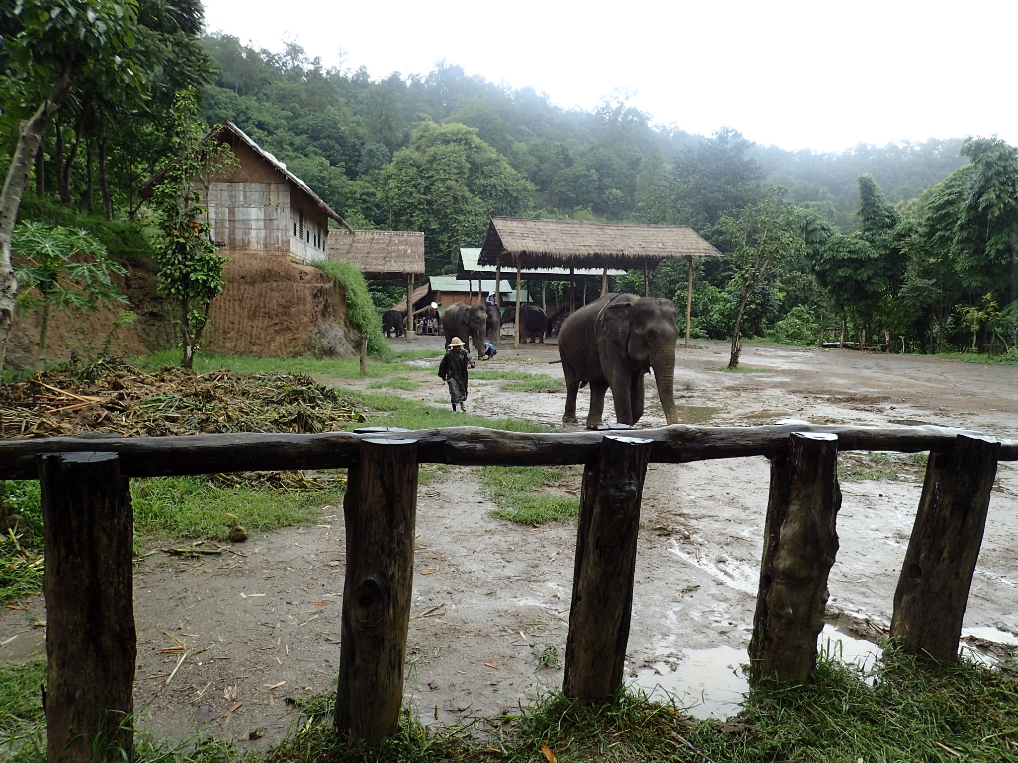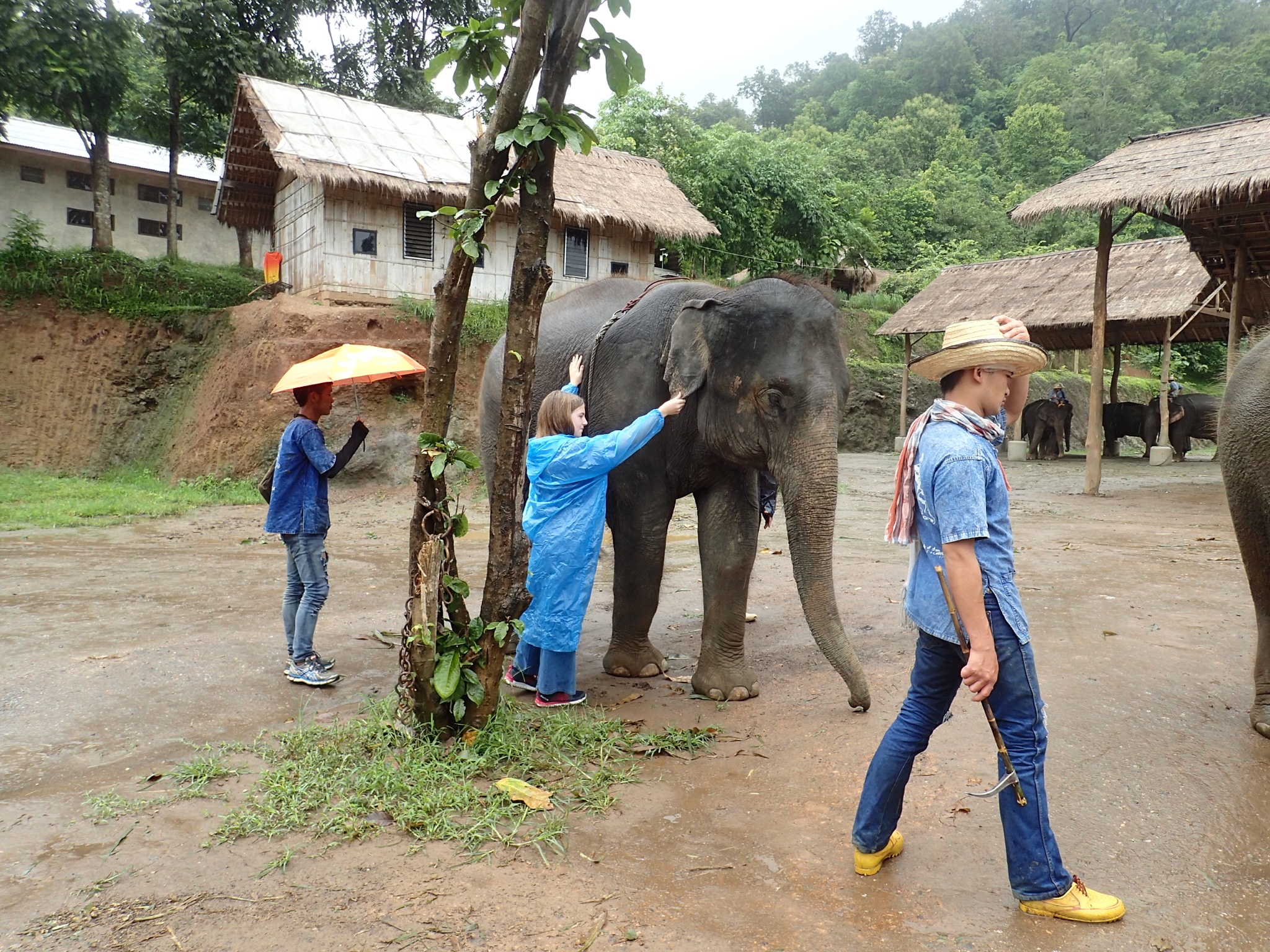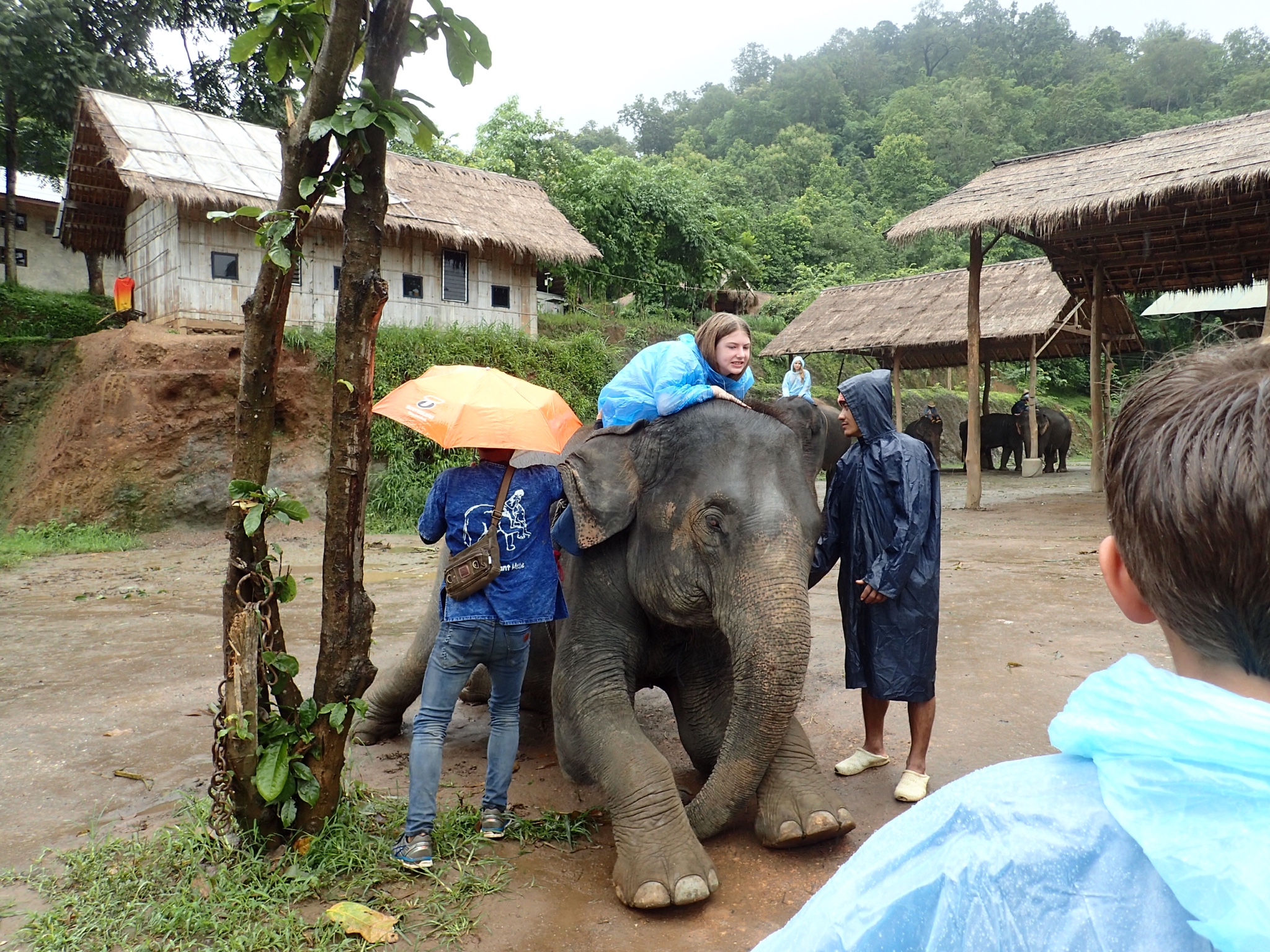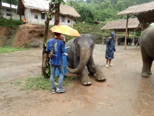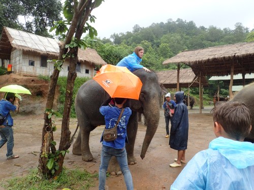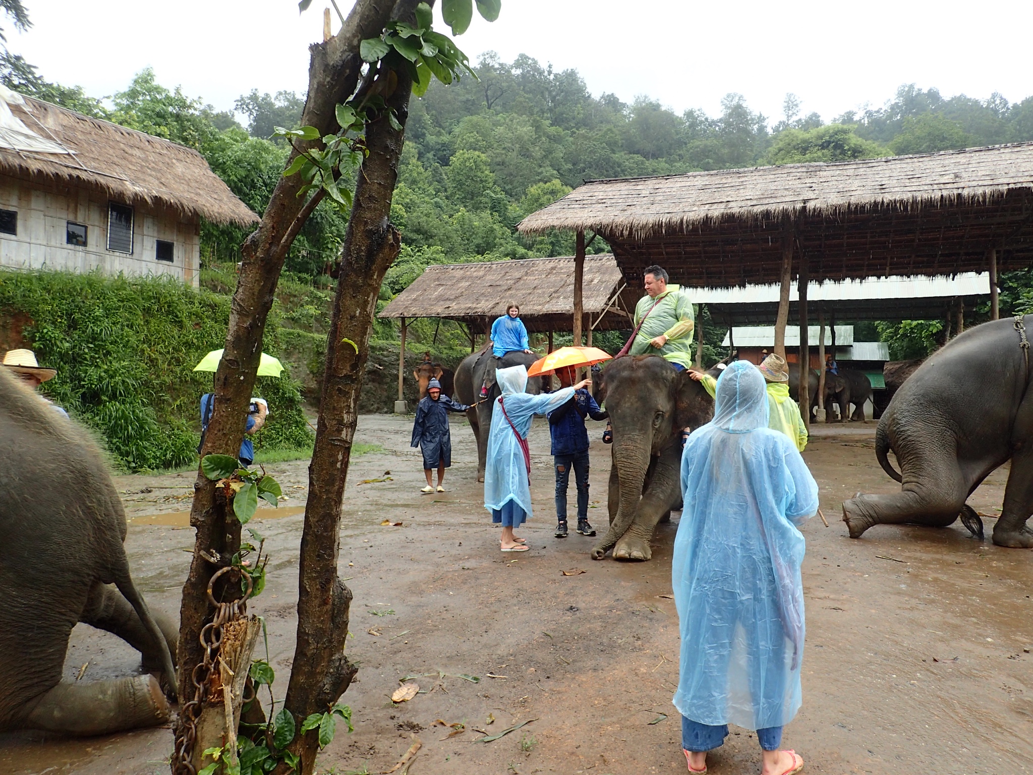The Thai Elephant Camp is proud of their reputation as one of the more humane elephant camps. We would be riding “bareback.” Other camps use the large basket and allow up to three people on board. Our guides said that was too much weight for an elephant to carry. They also allow only one guest per elephant, so the experience remains an intimate one. We each would get one elephant to ride. There are only 13 elephants at the camp, so no more than 13 people can be here at any given time. On our trip today, we were with a honeymooning couple, a family of four from Paris, and the father and his two sons who rode up with us.