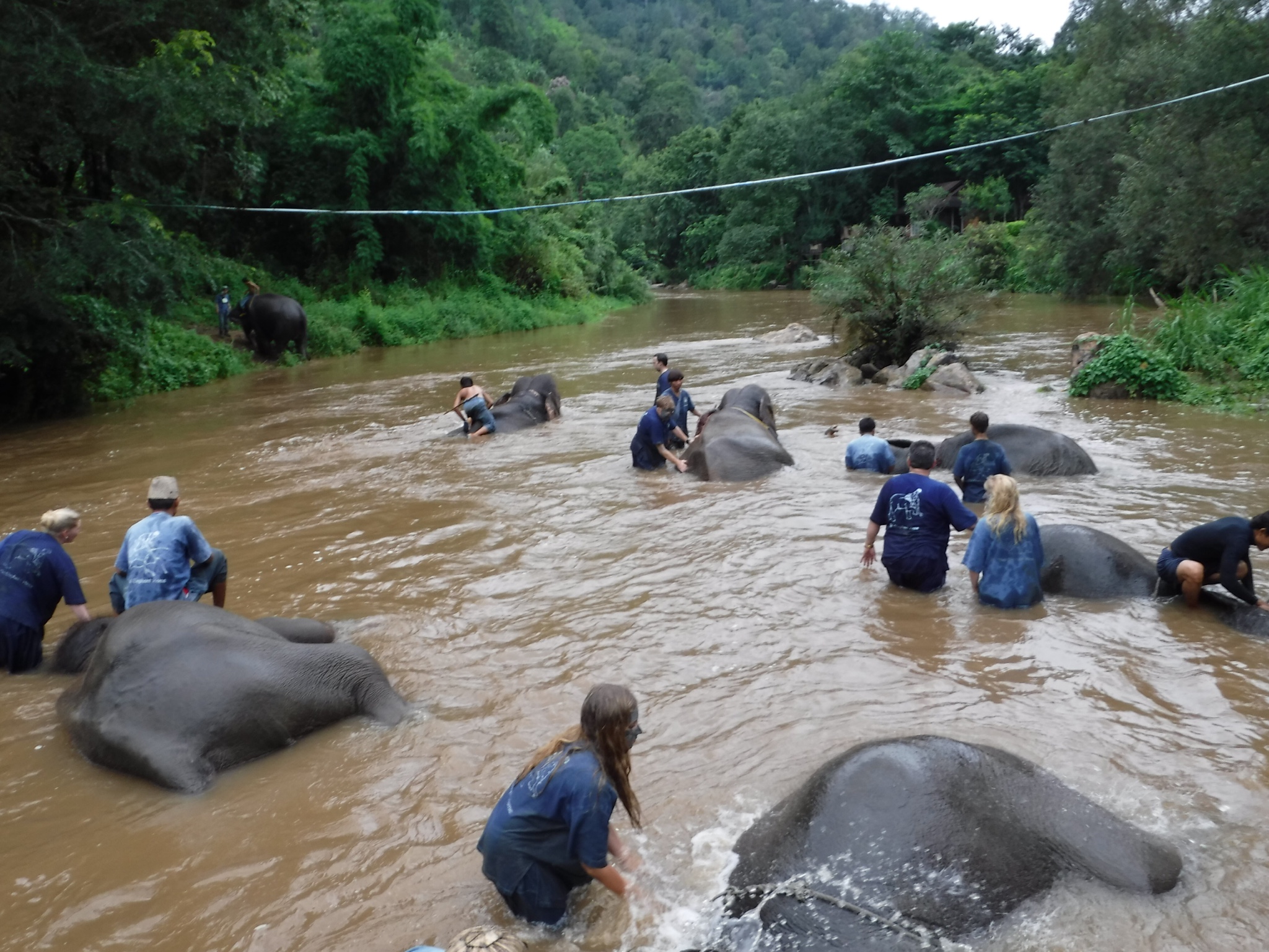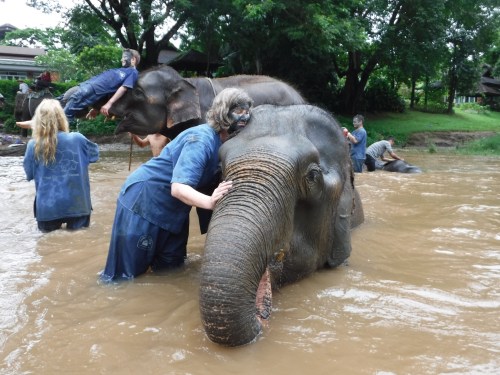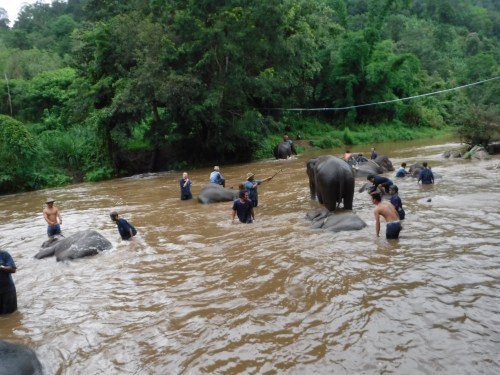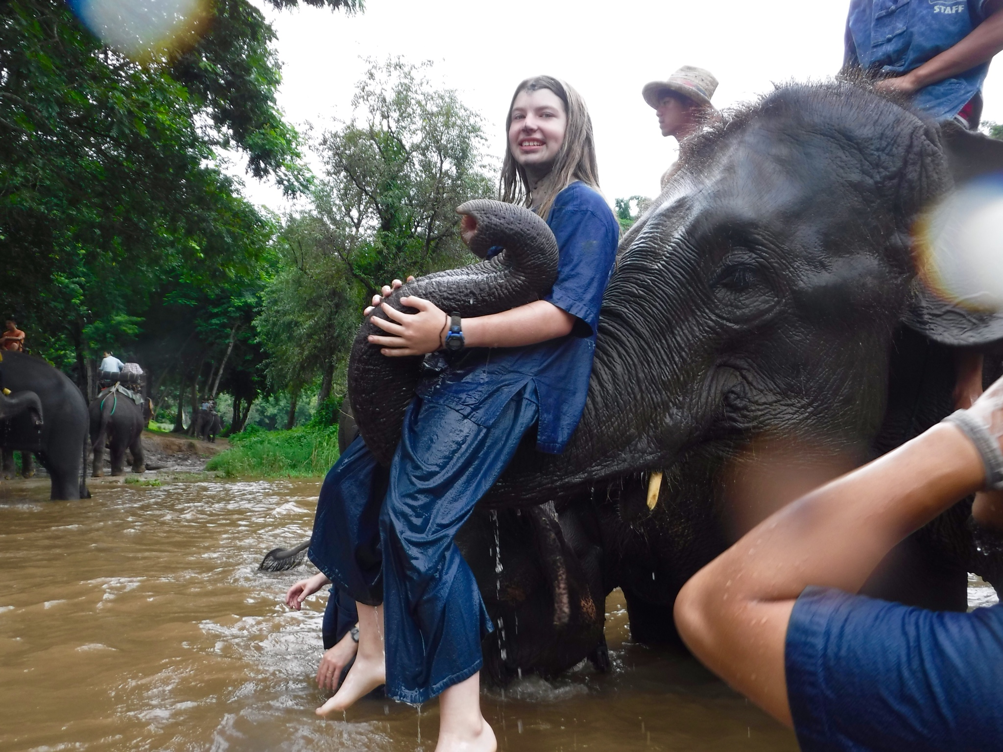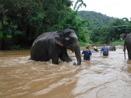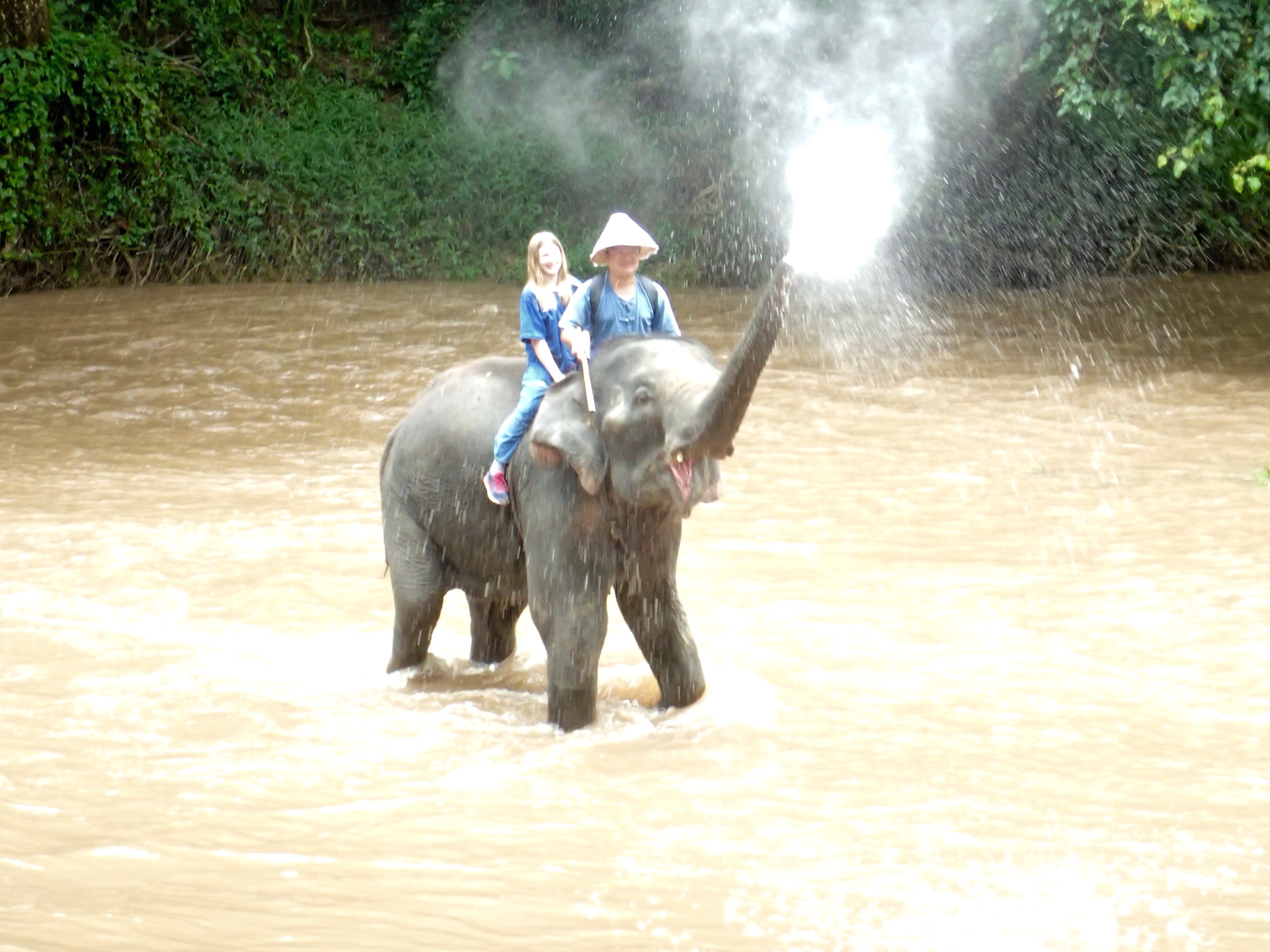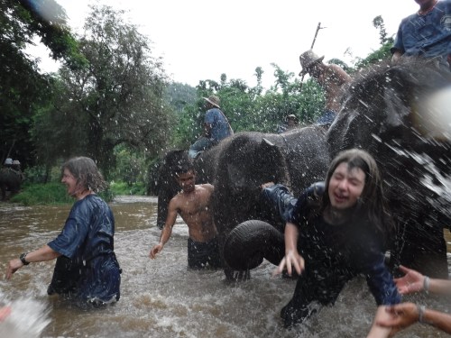 The mahouts said, “Map long” right in the middle of the river, and our elephants went down and we all got soaking wet.