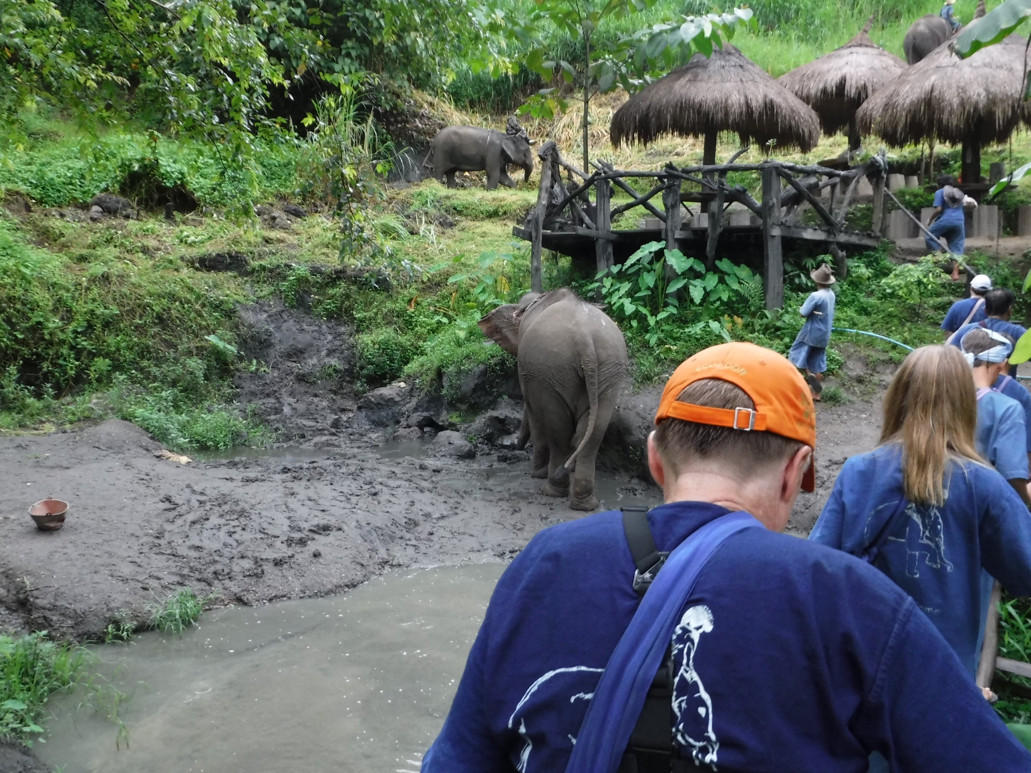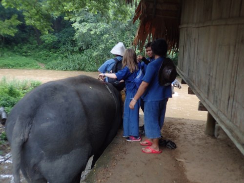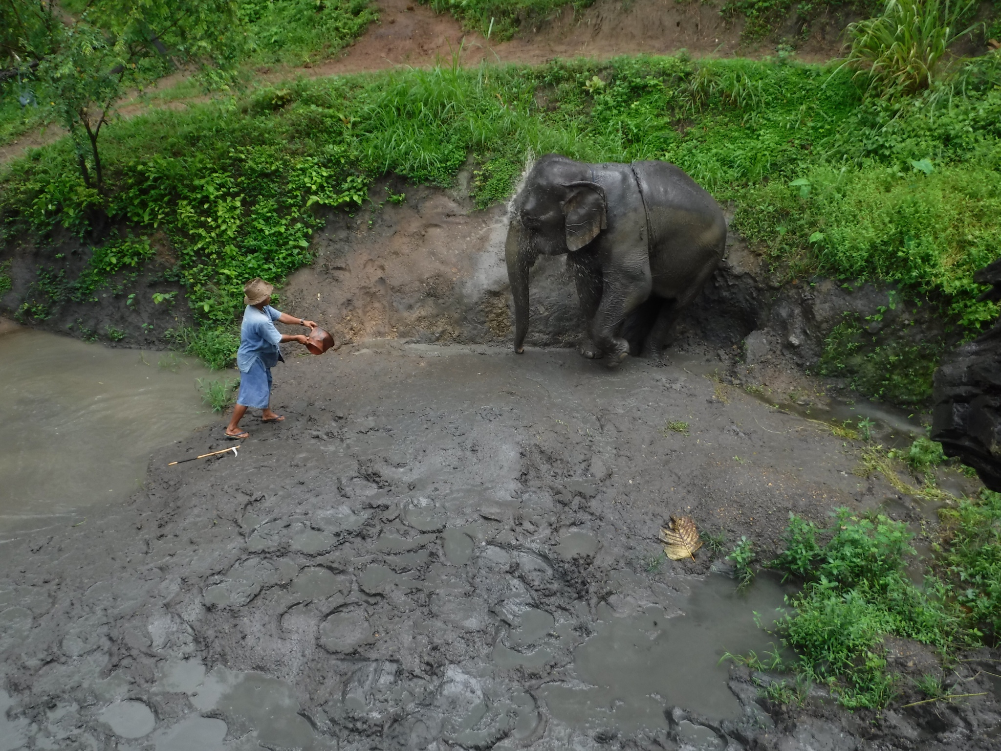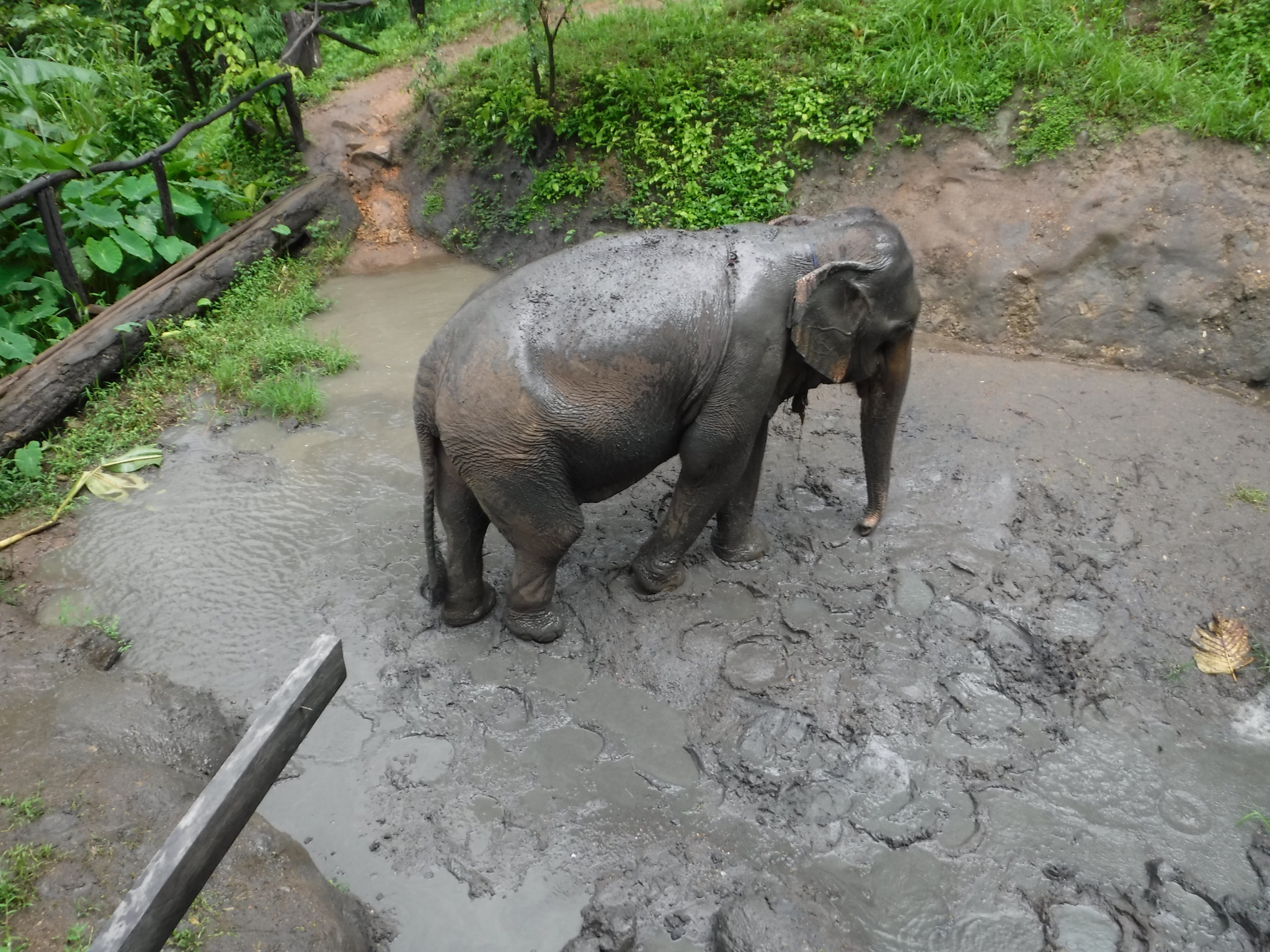 After lunch, it was time for the mud spa. Our guide picked one elephant (they take turns), and she laid down in the dark gray clay. We rubbed her entire body with it, stem to stern.