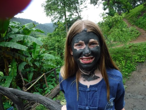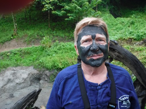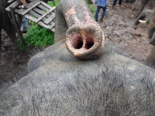 The humans got to use the black clay on our faces too. We spread it on our entire faces and let it dry into a hard pack. The honeymooner girl had appeared this morning in full make-up, gold sandals, and painted fingernails. She didn’t let her hubby spread the mud all over her. I thought it odd that she got all fixed up to go ride an elephant, but to each his own. I look for any excuse NOT to wear makeup.