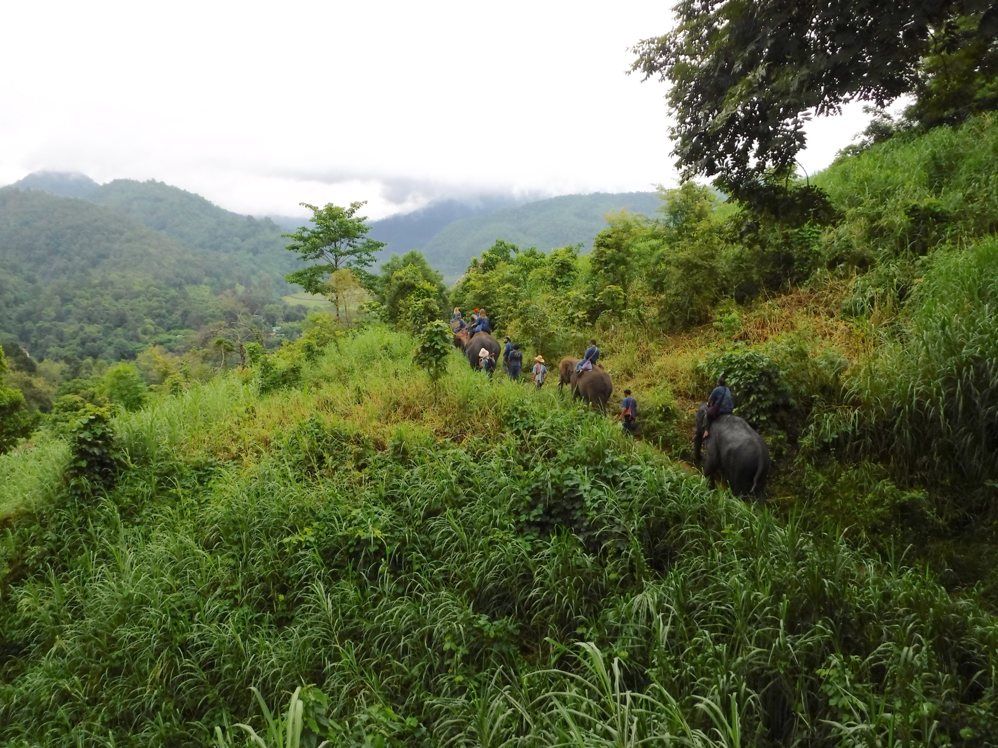 With just a couple of minutes of practice, we started our journey. We rode right into the jungle. At first, I thought it was going to be a very long day because I felt wobbly on top of my ride, a good sized girl named TJ. Greg was aboard Scooby Doo, and Genene had Hero. I wonder how many people actually fall off their elephants. It seemed easily possible. There was a rope around their bellies, but you had to reach behind you to hold on. I tried that for a while, but it seemed awkward. Adding to the tension was the fact that we were walking up and down slippery trails with sharp drop-offs on one side or the other. If the elephant turned her head out over the hillside, you were quite literally dangling out into space. That took some getting used to. I was amazed at how sure-footed the elephants were. The trails were slick with mud, but the elephants never slipped. They walked very slowly and put each foot down in the right spot.