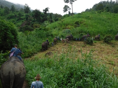The elephants remind me of horses in one way: they love to eat and will try to do so as they walk along. Our guide told us that elephants sleep about five hours a night, laying down on their sides. The rest of the time they spend eating and pooping. They would walk a few steps, stick their trunks out on the side of the trail, and snag a bite. The command to go (pbai or huy) was a constant refrain from the mahouts. My elephant, TJ, was bringing up the rear, and she was very smart. She realized that she could get away with eating a lot more if she rushed up right behind the elephant in front of her. As long as the elephant train was stopped, her mahout wouldn’t fuss at her for eating so she could munch away.