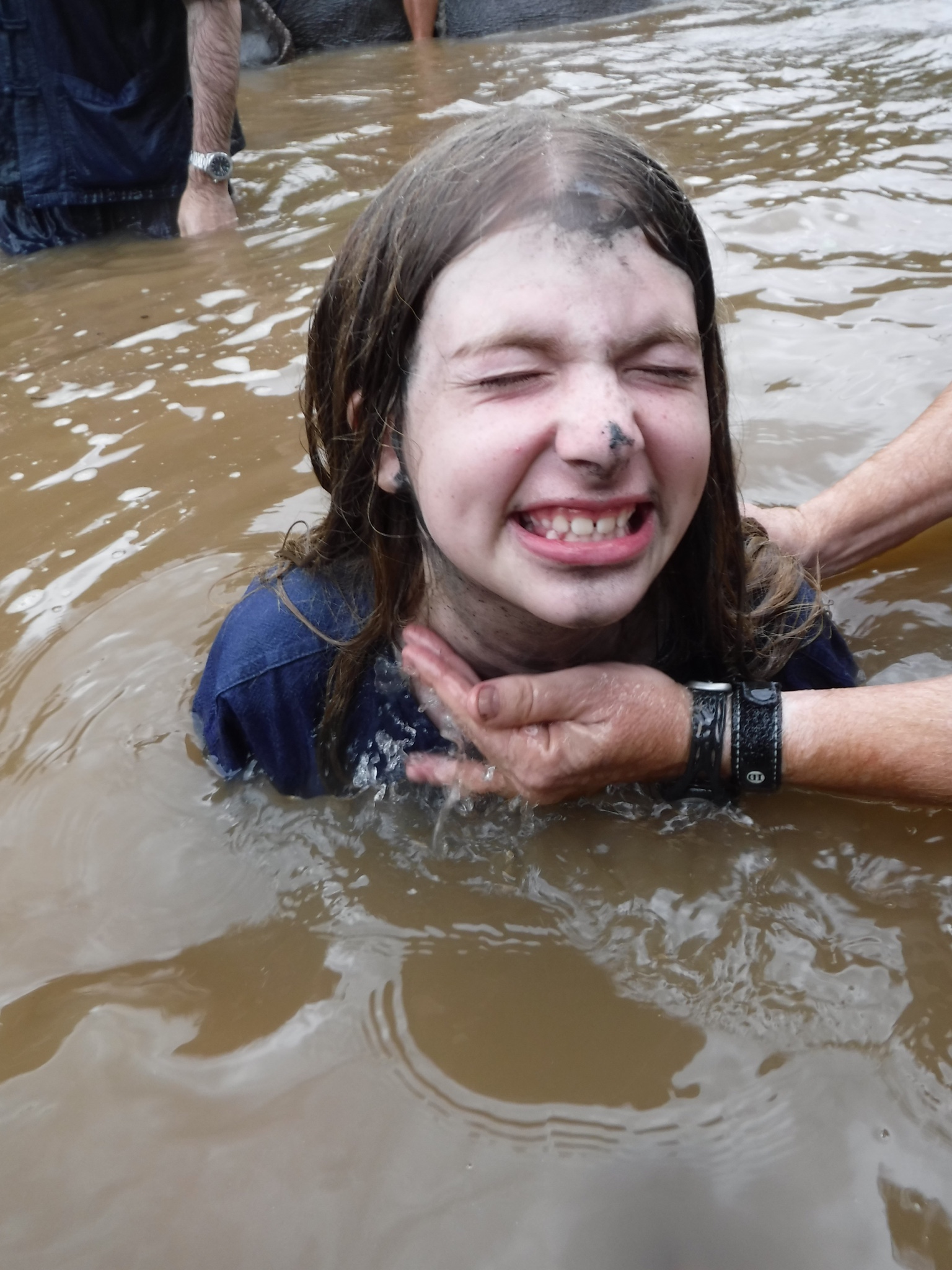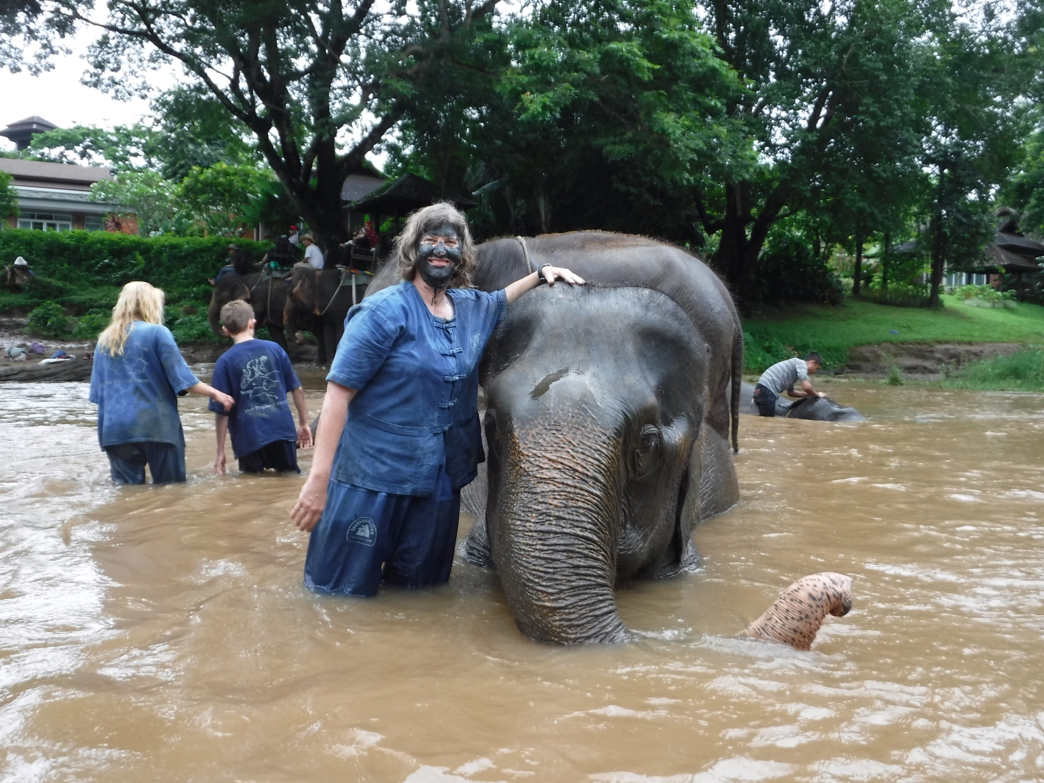 We splashed and squealed and threw water on ourselves and our elephants. We washed off the clay masks. The mahouts threw water on one another. We took turns getting lifted up by the trunks.
