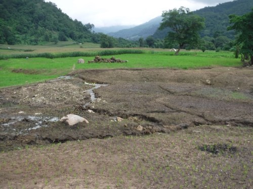 We kept driving north and the city fell away. We saw rice paddies, palm trees, and mountains in the distance. A light rain was falling.
