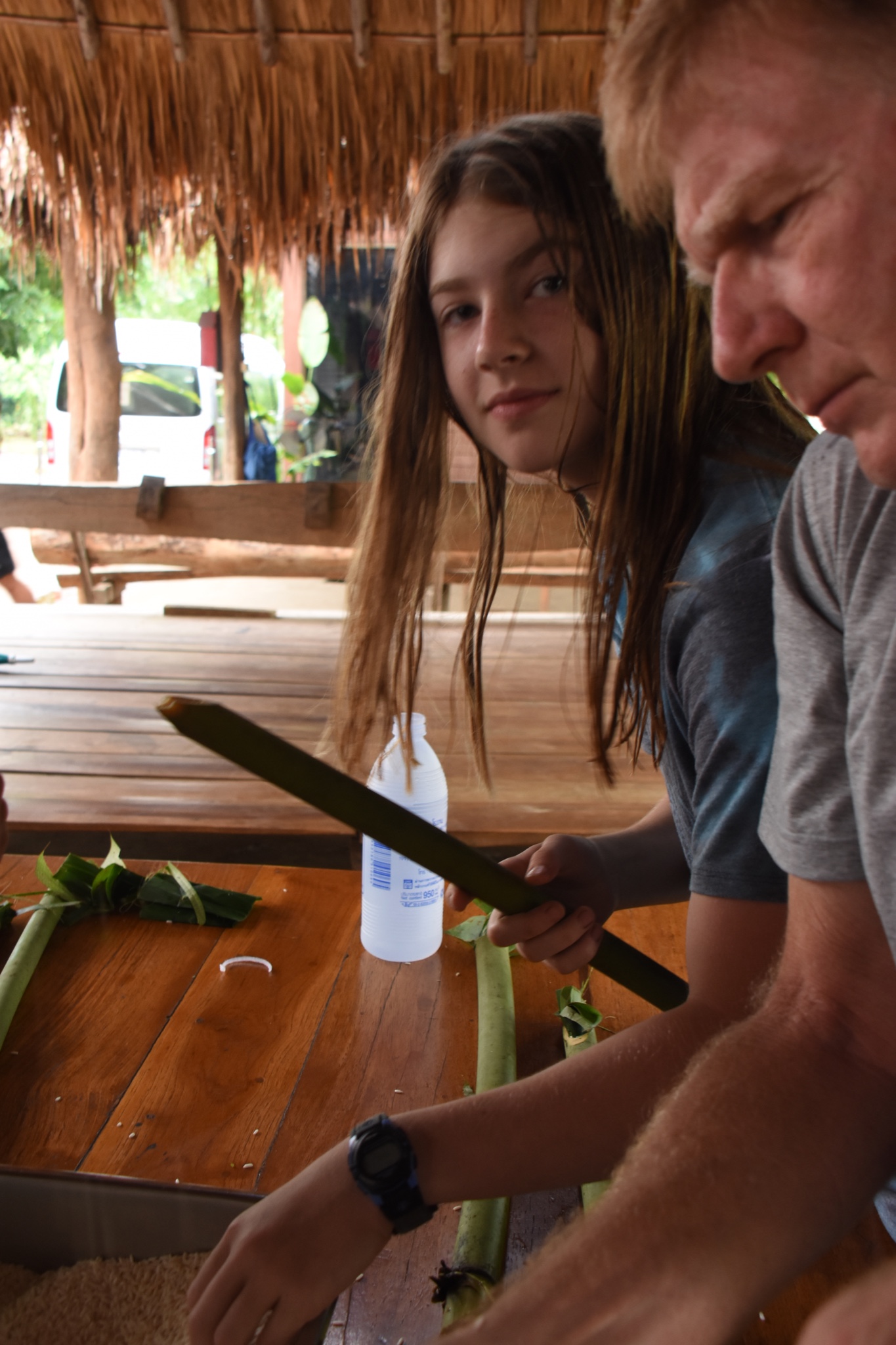 At 4:30, our guides taught us how to make a mahout dinner. Greg was much more in his element working with food. There are times when the elephant and mahout used to go into the jungle together, although our elephants were chained in the paddock below us. When in the jungle, the elephant may be allowed to range and might get a good distance from the mahout. No worries. All you need for a night in the jungle is some water, rice, a bamboo stick and fire. We stuffed the bamboo sticks with rice until about 3 inches from the top.